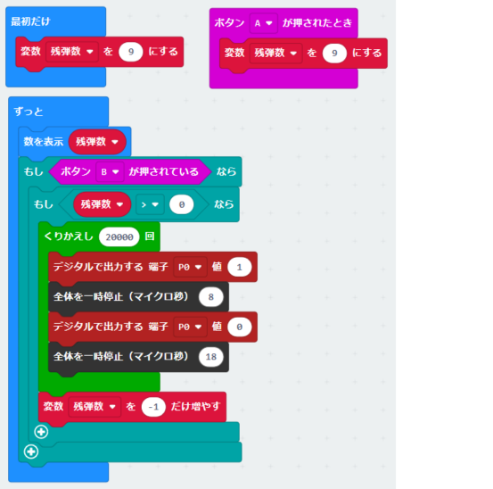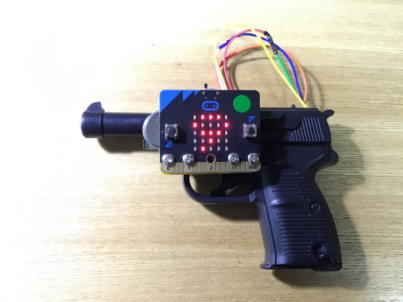 もっとそれらしくしたいなら、おもちゃのピストルを改造する方法もあります。この例はダイソーのBB弾のピストルのトリガーにマイクロスイッチをつけたものです。マイクロスイッチをP0と3Vに接続して、トリガーを引くとP0がHighになってトリガーを検知します。若干工作が必要ですが、スイッチの感触が良い感じになります。