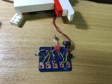試作品はmicro:bitサイズのユニバーサル基板に実装して、ビスでmicro:bitのポートと接続しています。
