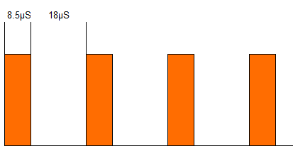 基本は赤外線LEDから出る光を周波数38KHzで変調、つまりLEDを毎秒38000回点滅してやります。38KHzの1周期は1/38000秒≒26.5μ秒となります。ただし、ON/OFFのデューティー比は1:1(50%)でなく、1:2(33%)程度で構わないようで、これはLED点灯のための電池の節約が理由のようです。具体的には点灯が8.5μ秒、消灯が18μ秒を反復することになります。