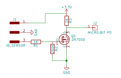 赤外線がセンサーに当たっていない時、センサーの出力はHiになり、FETのゲートに3Vほどの電圧がかかります。ドレイン・ソース間は導通状態となり、micro:bitのポートは接地状態になります。micro:bitから見るとデジタル入力=0の状態です。