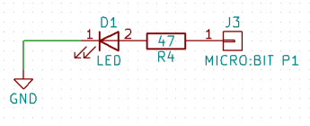 流せる電流は、LEDの最大定格は100mAですが、micro:bitのポートが最大90mAなのでこれ以下になります。とりあえず40mA程度流すとすると、2÷0.04=50Ωの制限抵抗を入れることになります。E6系列の抵抗で一番近い値の47Ωを使用します。