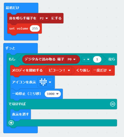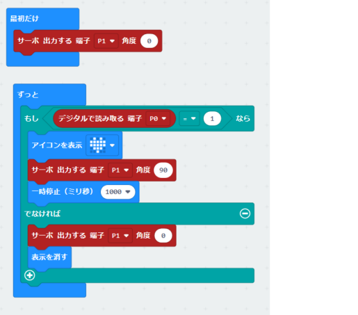受信側のソフトはシンプルで、ポートのデジタル入力=1になれば赤外線が照射された、銃にヒットされたの判定でOKです。この例ではP0にセンサーの出力(上記回路図のJ2)が接続されています。