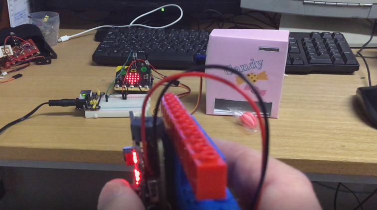 以前別件で作ったキャンデー自動販売機の模型とセットにしました。プログラムは倒れるターゲットと同じで、命中するとサーボを回してキャンデーを落とすだけです。