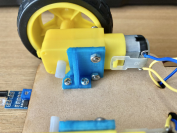 TTモーター(汎用のギヤ付きモーター)はビスでとりつける必要があるので、3Dプリンタでパーツを作りましたが、寸法の合うL字金具などを工夫することもできそうです。