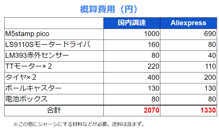 センサーで障害物を避けて走る、という定番の機能に絞ると調達価格はこんな感じになりそうです。