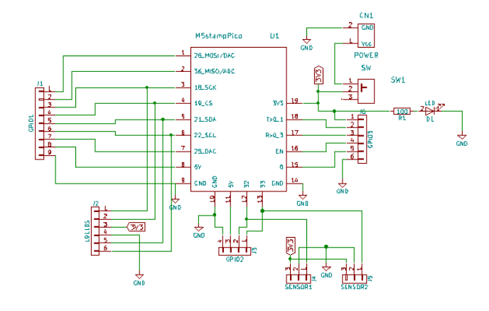M5Stamp picoに電源やモータードライバーを接続するための基板を作りました。ほとんどピンソケットだけでできているものになってしまいますが。