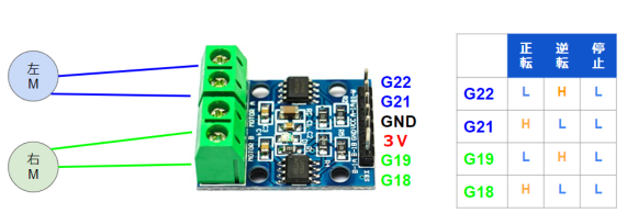 モータードライバーは一般的なHブリッジ構成で、2つの入力ピンのHigh,Lowによってモーターの回転方向が変わります。入力をPWMにすることで回転数の制御もできます。入力ピンを直接M5Stamp pico基板に挿せるように、基板の裏面にピンソケットをつけてあります。左右2つのモーターを制御するため、モータードライバーも2個あり、全部で4つの入力端子があります。これらをM5Stamp picoのGPIO G18,19,21,22で制御します。