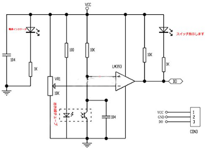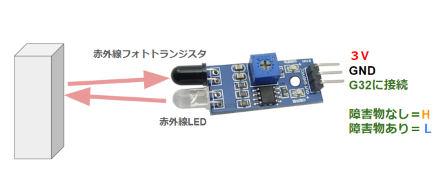 障害物センサーは赤外線LEDとフォトトラの組み合わせです。障害物があると赤外線が反射されてフォトトラに入力され、フォトトラが導通し、接続されているLM393(コンパレータ)の出力がLowになります。この出力の変化をM5Stamp picoのGPIO G32で読み取ります。