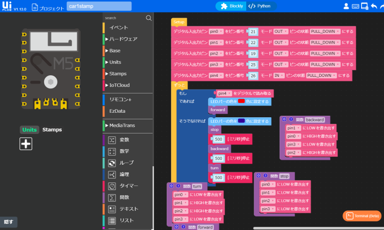 M5StackからはじまったM5シリーズは、Arduino IDEでもプログラミングができますが、オリジナルのブロックプログラミング環境のUIflowを使えます。これは日本語化されているので、micro:bitやScratchには及ばずとも、かなり敷居を下げることができます。