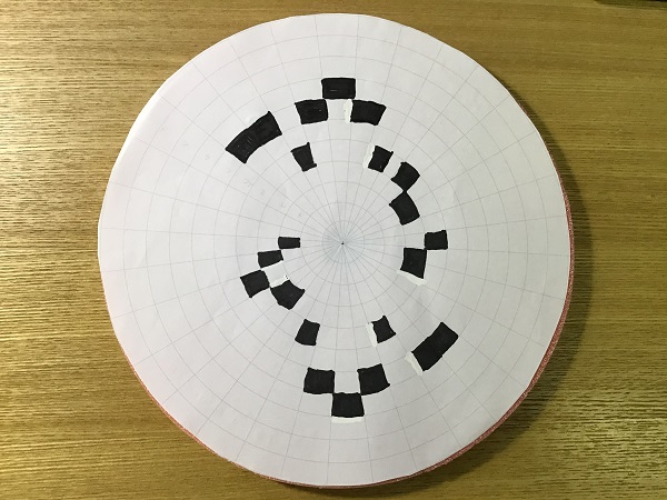 ディスクの円周を32等分し、32個の音を置けるようにします。32等分した扇形は同心円で8つに分割し、8つの音階を表し、黒く塗ったところ(光反射のないところ)が音が出るように考えます。