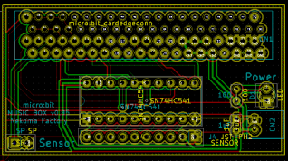 QTR-8Aの出力はアナログです。センサーに反射がないと出力に3V程度の電圧が出て、反射があると0V近くに落ちますが、アナログなので中間の不安定な状態になる場合があります。micro:bitに安定したデジタル入力をするため、センサーとmicro:bitの間にバッファを接続します。