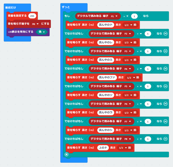 micro:bitのポートのP0をスピーカーに、P1~P8を音階に対応するセンサーからの入力にします。