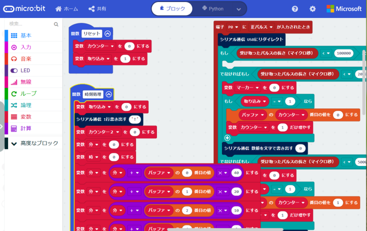 micro:bitには「入出力端子」のカテゴリに「P0に正パルスが入力されたとき」や「受け取ったパルスの長さ(マイクロ秒)」というブロックがありますが、まさにこういう場面で使う機能でした。