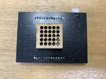 基板にしたものがこれ。中央にかたまっているのがフォトトランジスタです。フォトトランジスタはとなりのLEDの影響を受けないようにMDFで作ったフードを被せてあります。この状態でmicro:bitのLEDに密着させます。
