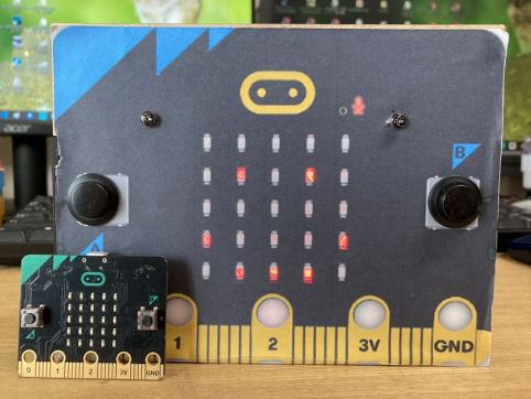 micro:bitを教材にするとき、多くの生徒にLEDディスプレイの表示を見せたい場合があります。演示だけではなく、生徒の作品を共有したいこともあります。LEDが小さいので遠くの席の生徒から見にくいので、近くへ行って見せるとか、書画カメラで電子黒板に投影するとか、いろいろやるわけですが、いっそ演示用にデカいmicro:bitがあると面白いんじゃね?というプロジェクトです。学校の黒板用に巨大な三角定規や分度器がある、アレと同じ発想ですね。