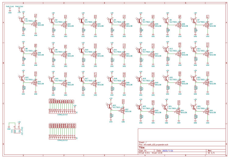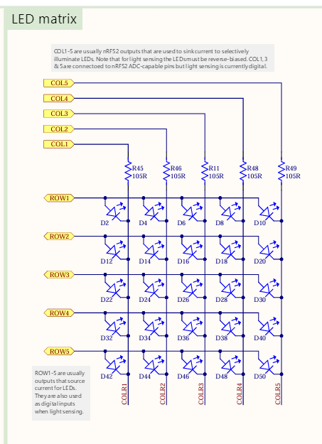 micro:bitのLEDは5x5のマトリックスになっていて、内部のMCUからはマトリックスの行・列にアクセスができ、個々のLEDを点滅できます。このマトリックスにカードエッジからもアクセスできれば、LEDの情報を外に取り出せるのですが、残念ながらカードエッジには列(Col)の情報しか出ていません。(逆にこの情報の使い方がよくわからない)
