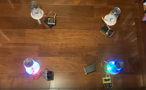 micro:bitの最大の特長の一つが、独自の無線通信プロトコルで複数のmicro:bitを同期できるところです。複数のランタンを無線で同期すれば、複雑な合奏ができるのでは、ということで、とりあえず4つのランタンでカノンのようにメロディをリレーさせてみました。