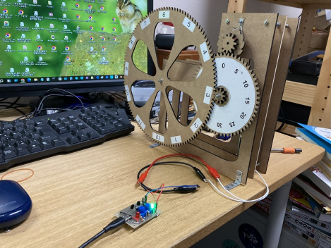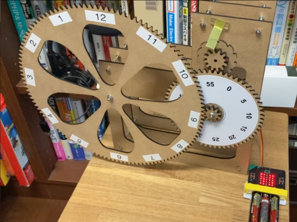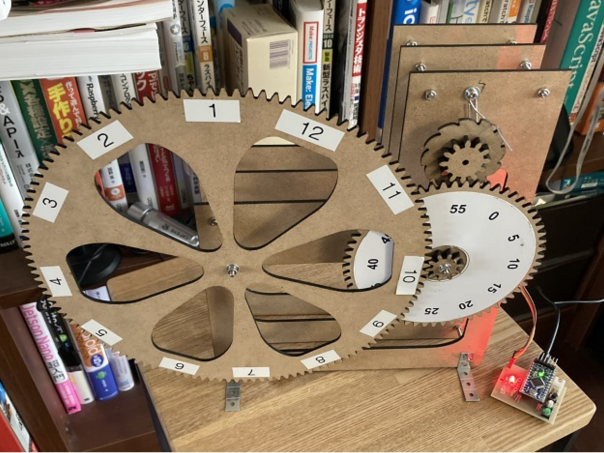 多段に歯車を組み合わせたり、分針・時針を同軸にすれば時計らしくなりますが、一番簡単に作れて原理が見えやすいものにしてあります。