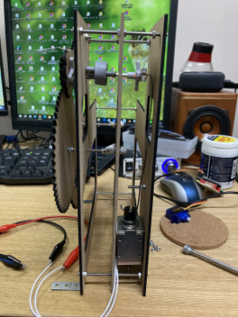 製作例の場合は、サーボに接続された歯車は1分で30度回転しますので12分で一周します。同軸に12歯の歯車Aがあり、それに60歯の歯車Bが接続されています。