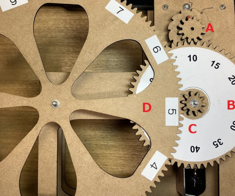 60分かけてサーボに接続された歯車Aが5周すると、噛み合っている歯車Bが1周するので、歯車Bを分表示に使用しています。