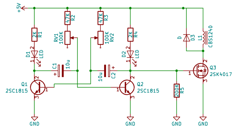 周期的な電流を発生させるにはマイコンを使えば簡単ですが、もっと単純な無安定マルチバイブレーター回路を使うこともできます。