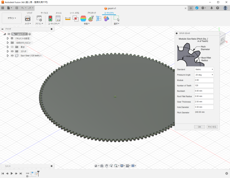 歯車はFusion360に「SPUR GEAR」という歯車専用のアドインがあるので、これを利用します。作成したデータをSVGに変換してレーザー加工機のアプリケーションに持ち込めばMDFを切り出すことができます。