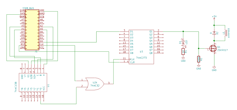 インターフェースは最低限の構成です。アドレスは3ビットのデコーダー(74HC138)でアドレスバスの下位の3ビットを使えば8個のレジスタが選択できますが、この作例では1個で十分です